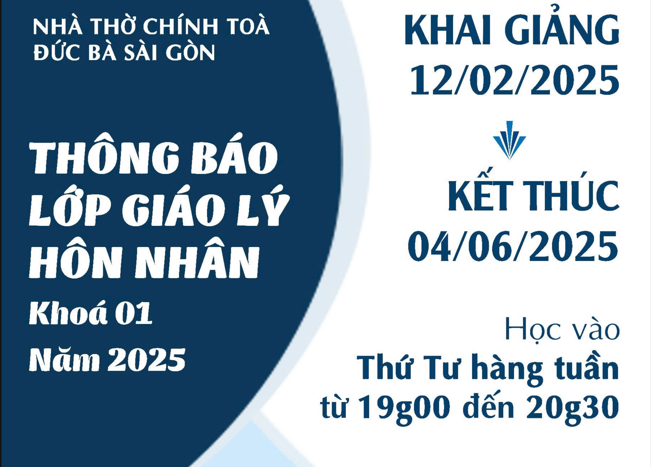 GX Chính Tòa Sài Gòn (Đức Bà) 4 months agoLớp Giáo lý chuẩn bị Hôn Nhân 02-2025: học vào tối thứ Tư hằng tuần, từ 19g00 đến 20g30, tại Nhà Mục vụ, số 01 Hàn Thuyên, phường Sài Gòn, TP.HCM. Thời gian của Khoá học: 06.8.2025 – 26.11.2025
