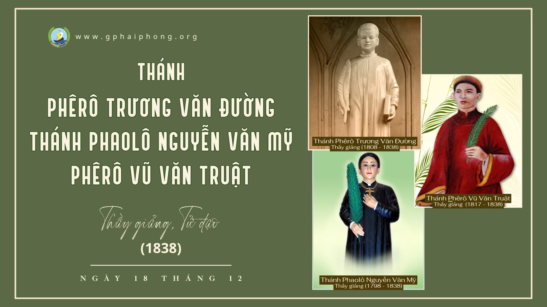 GP Hải Phòng 2 months ago✅Thánh Phêrô Trương Văn Đường, Phaolô Nguyễn Văn Mỹ, Phêrô Vũ Văn Truật, tử đạo ngày 18 tháng 12 năm 1838