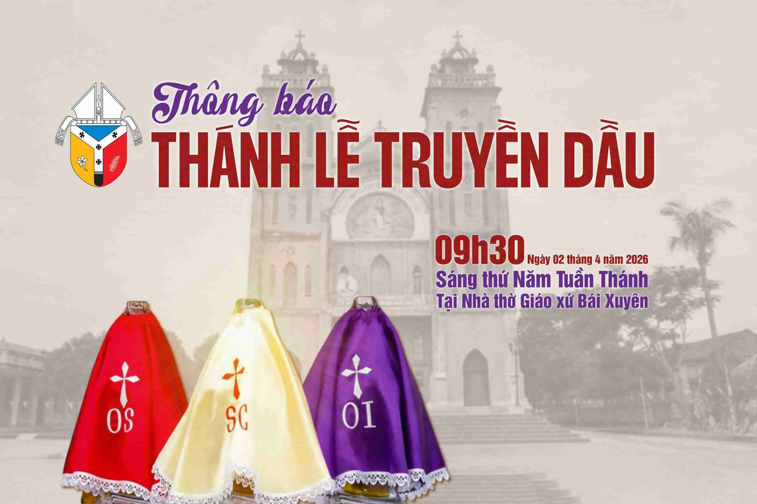 Đức Tổng Giám mục Giu-se Vũ Văn Thiên sẽ cử hành Thánh lễ thánh hiến và làm phép Dầu (Lễ Truyền Dầu) vào ngày 02/4/2026 tại Giáo xứ Bái Xuyên.