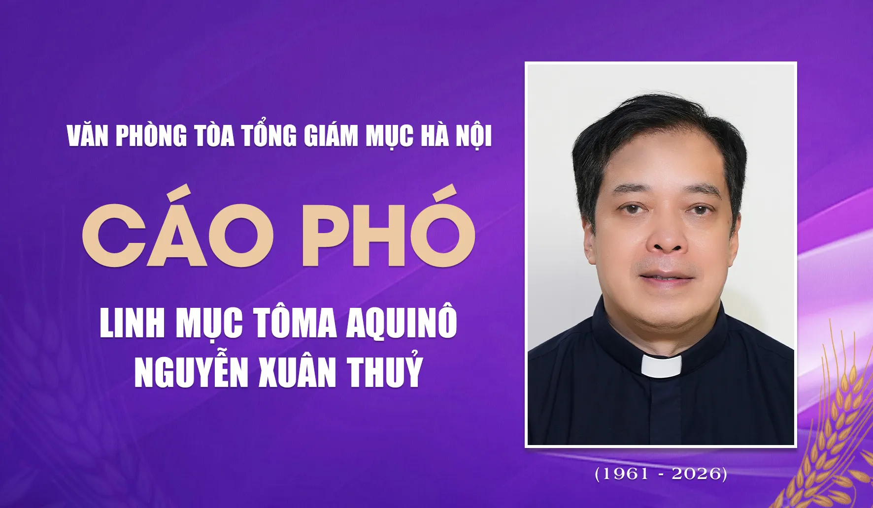 Linh mục Tô-ma A-qui-nô Nguyễn Xuân Thủy được Chúa gọi về lúc 17h45, ngày 01/01/2026 tại Tòa Tổng Giám mục Hà Nội, hưởng thọ 65 tuổi.