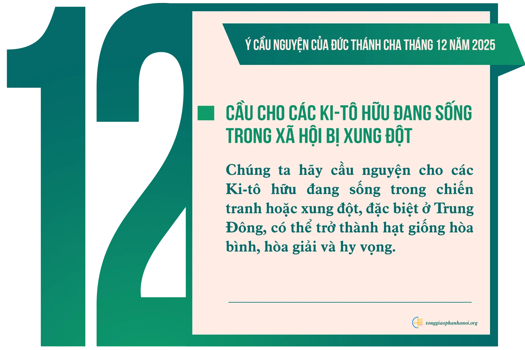 Chúng ta hãy cầu nguyên cho các Ki-tô hữu đang sống trong chiến tranh hoặc xung đột, đặc biệt ở Trung Đông, có thể trở thành hạt giống hòa bình, hòa giải và hy vọng.