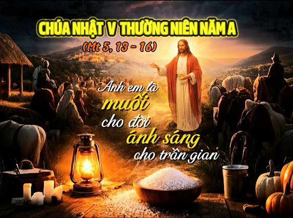 Tin Mừng theo Thánh Matthêu (Mt 5, 13–16), Chúa Nhật V Thường Niên. Tiếp nối giáo huấn về Tám Mối Phúc Thật, Chúa nói: “Chính anh em là muối cho đời… Chính anh em là ánh sáng cho thế gian.”